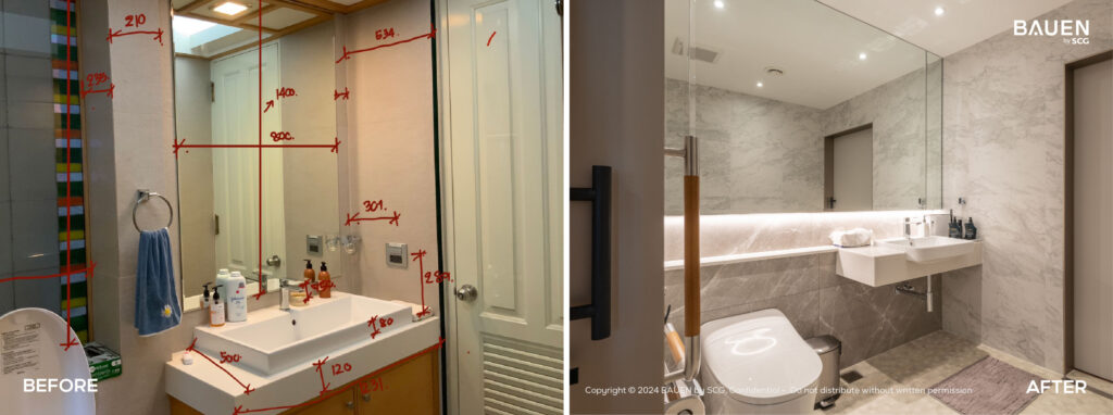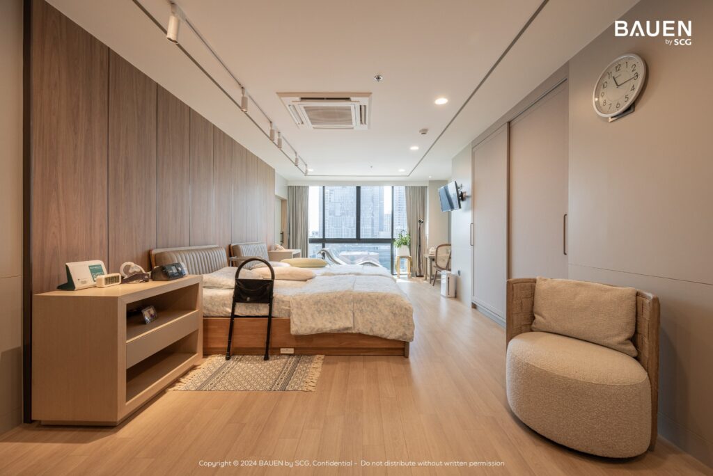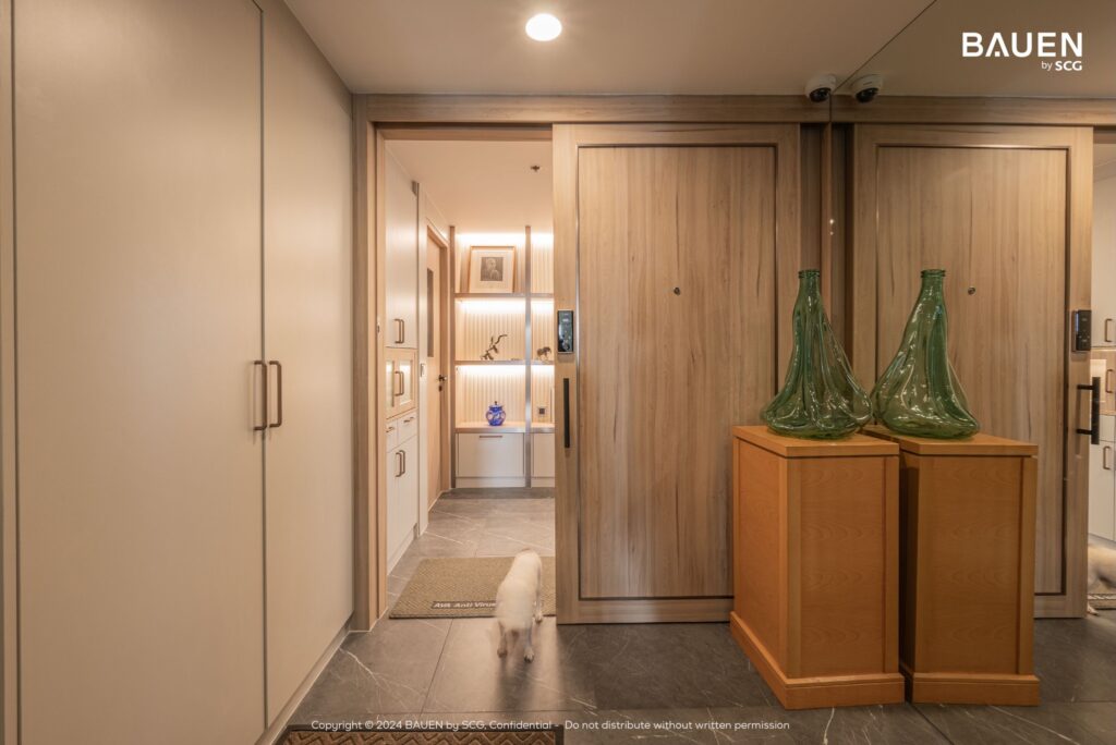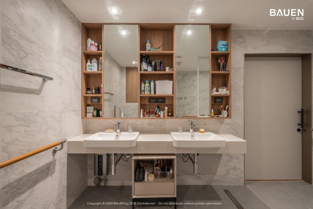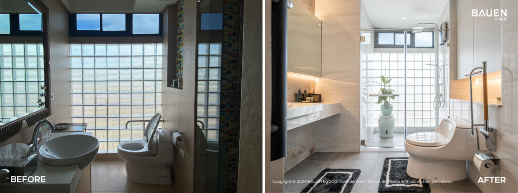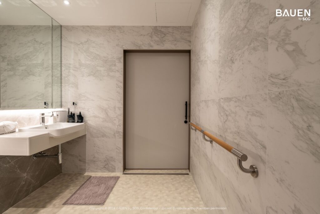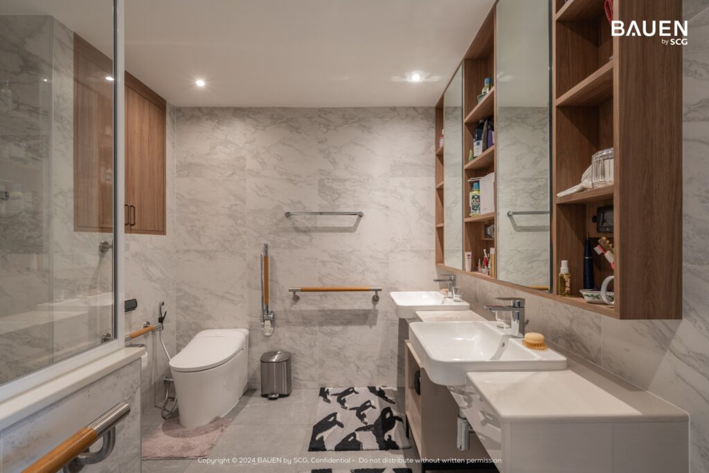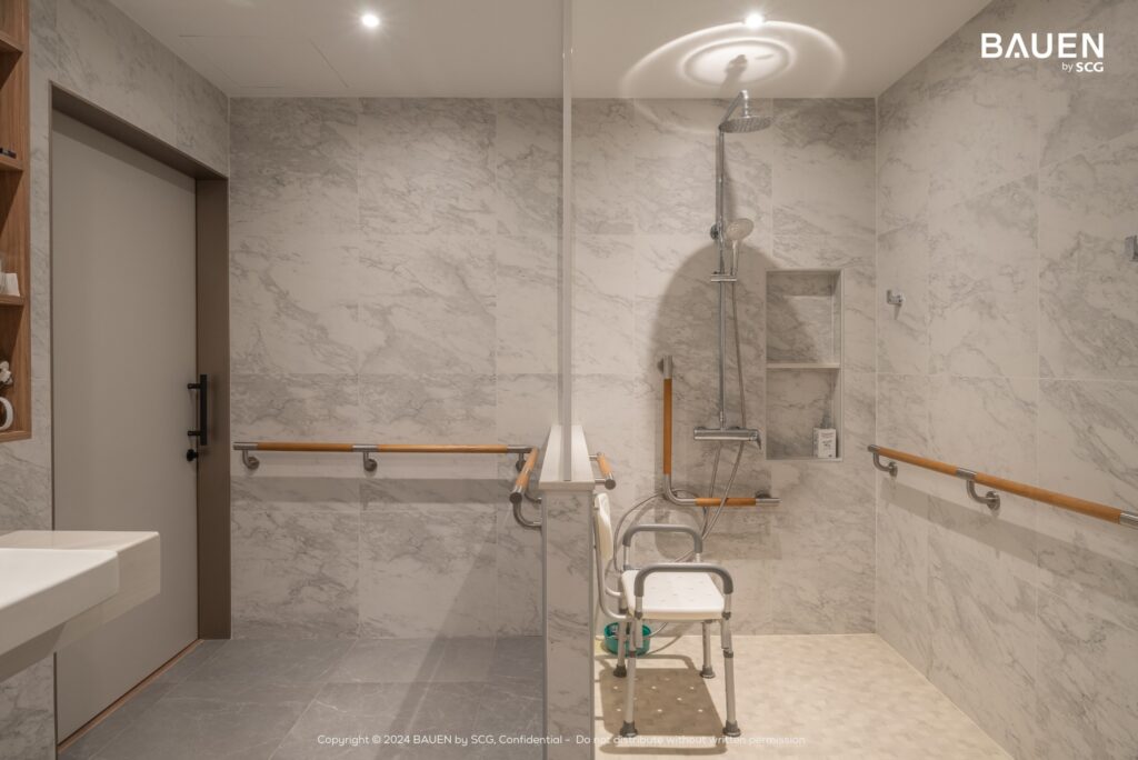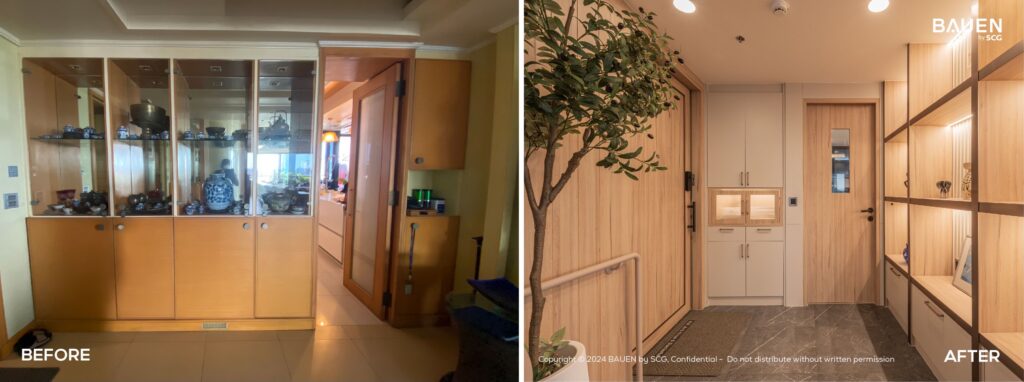 การรีโนเวตครั้งใหญ่จึงเริ่มขึ้น โดยมีหลักการออกแบบเพื่อผู้สูงอายุ “BAUEN Elder Delight” สอดแทรกเข้าไปเป็น Concept หลักของบ้านในทุกส่วนที่ผู้สูงอายุเข้าถึง ไล่ตั้งแต่โถงทางเข้า ห้องนั่งเล่น ห้องนอน หรือห้องน้ำ เพื่อให้มั่นใจได้ในการใช้ชีวิตอย่างสะดวก สบาย และปลอดภัย